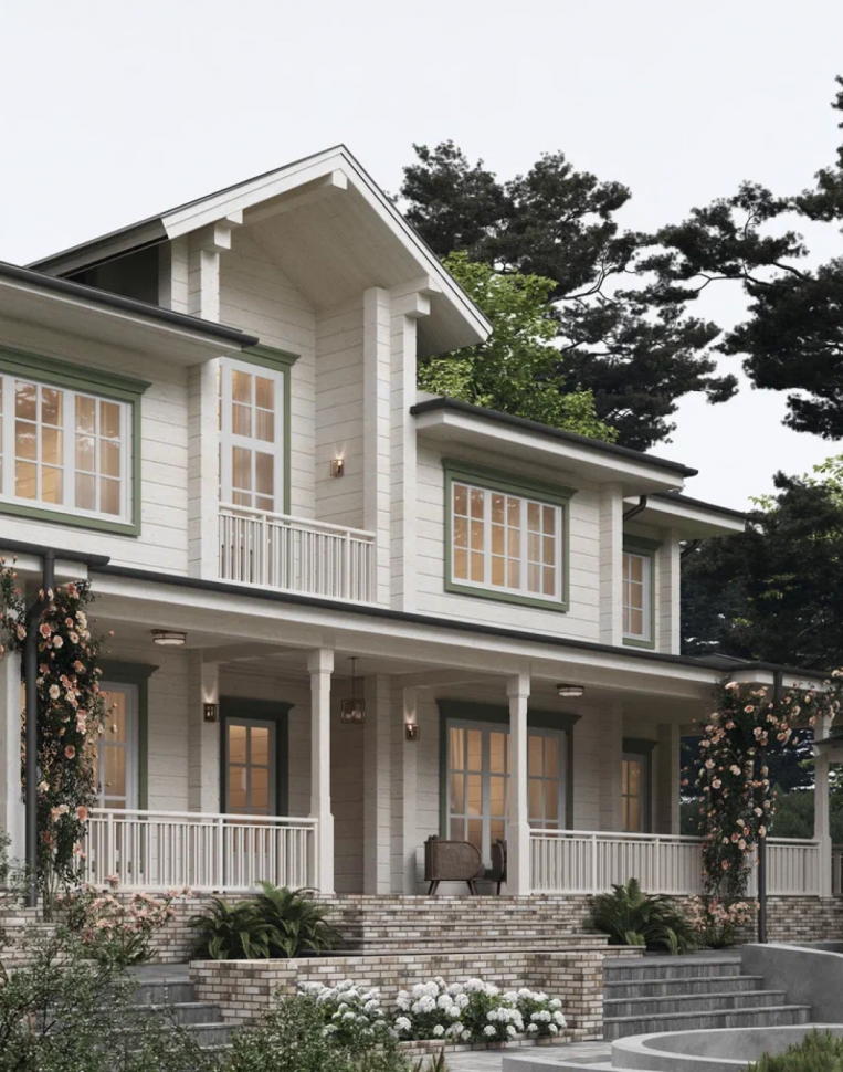 Дом в американском стиле идеально подходит для семей, ведущих активный образ жизни, особенно для семейных пар с детьми. В итоге на чертежах был «построен» просторный двухэтажный коттедж, с крышей сложной формы и большим количеством окон.