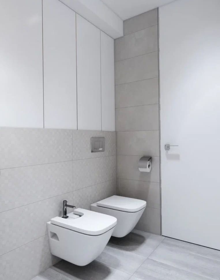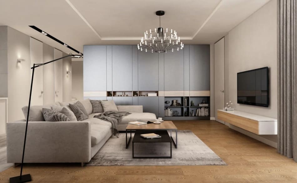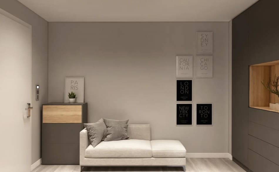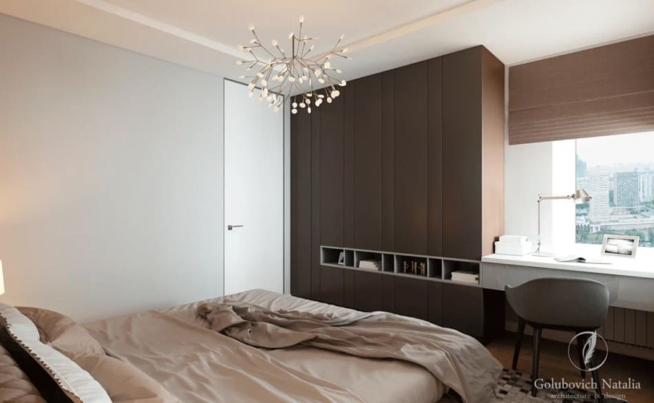 Дизайнер стремился уйти от деталей, чтобы пространство было единым. Также были заменены обычные двери на двери-невидимки. В случаях, когда полотно и отделка стены в одном тоне, как в нашем дизайн проекте, можно использовать алюминиевый профиль на торец полотна и полотно на тон светлее стены, нежели основная стена.