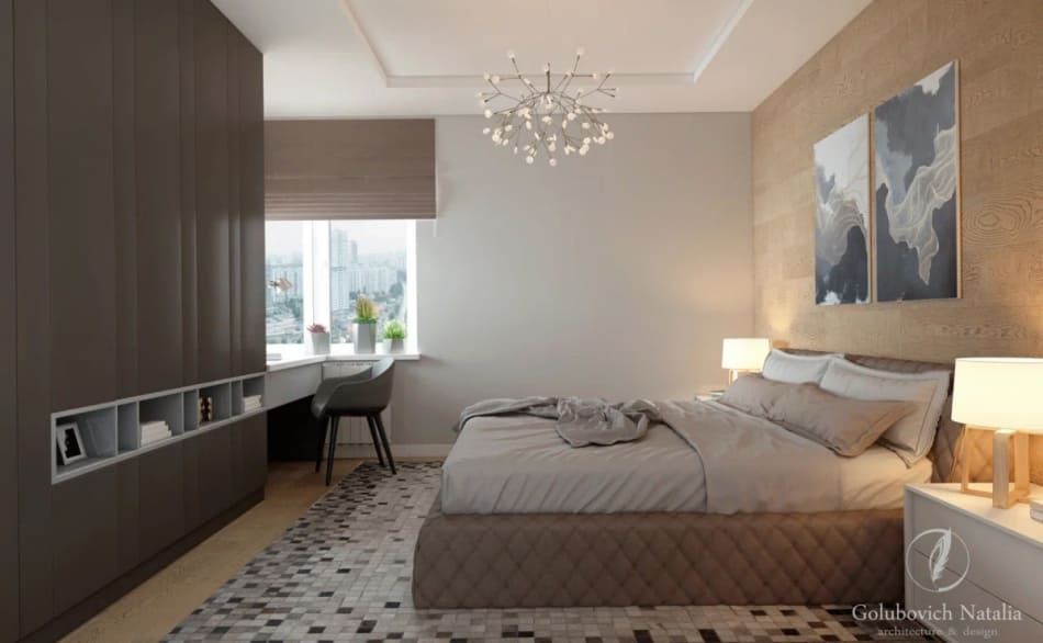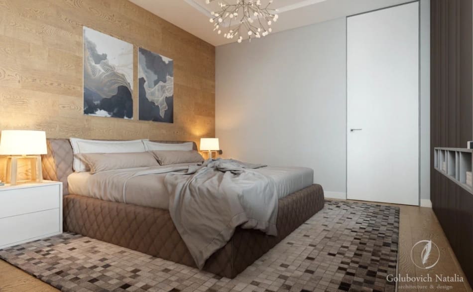 В отделке спальни нет ничего лишнего, в оформлении преобладает оттенок серого, но она не кажется скучной и безликой. Облицовка одной из стен в спальне выполнена деревянными панелями с чёткими горизонтальными линиями. В ванной комнате присутствует та же «прямолинейность» – вся сантехника имеет правильные геометрические формы.