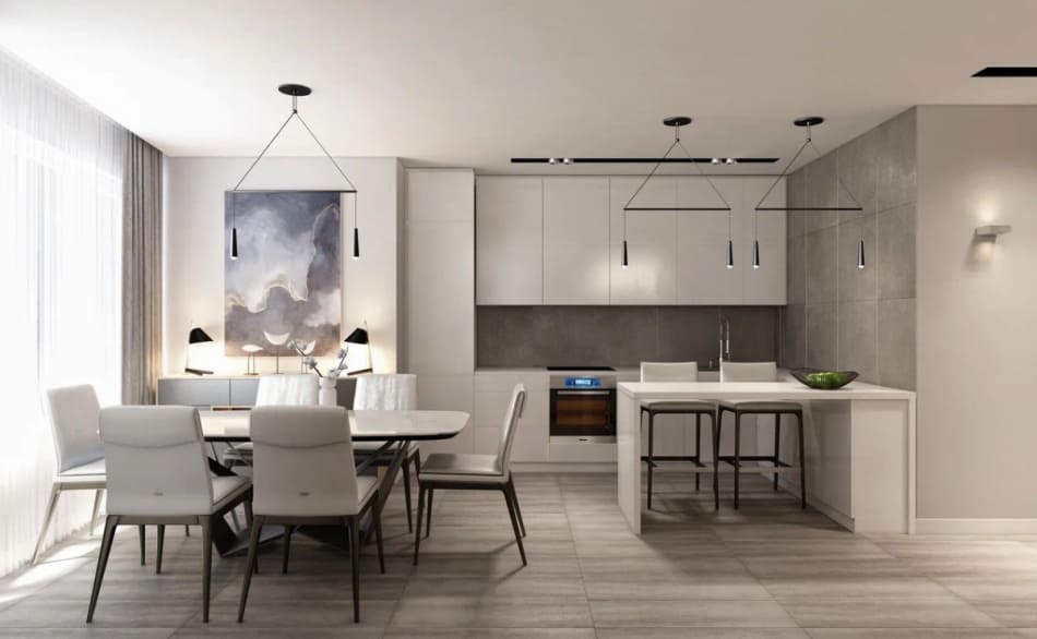 Изюминкой интерьера стала мебель фабрики Cattelan Italia (стол, стулья, диван) и подвесной светильник Moooi.