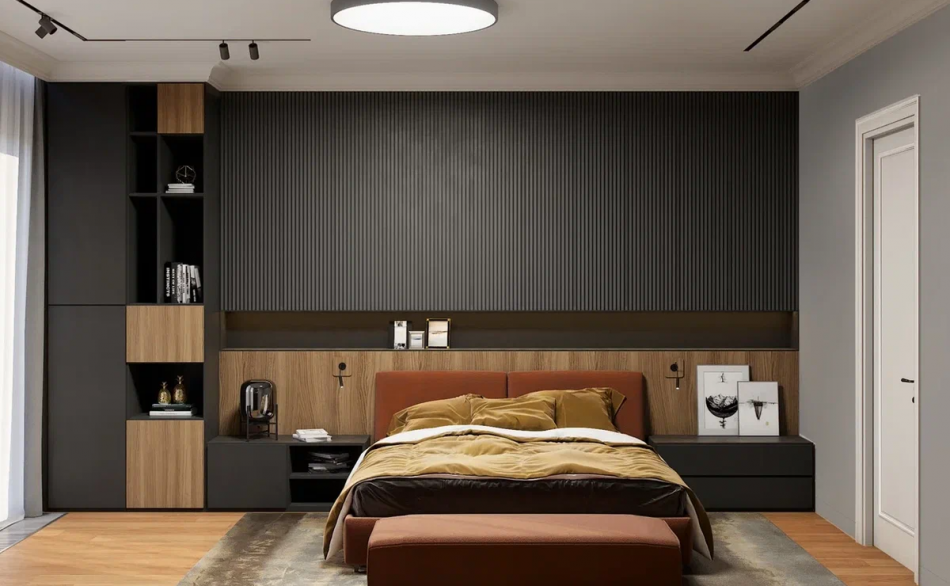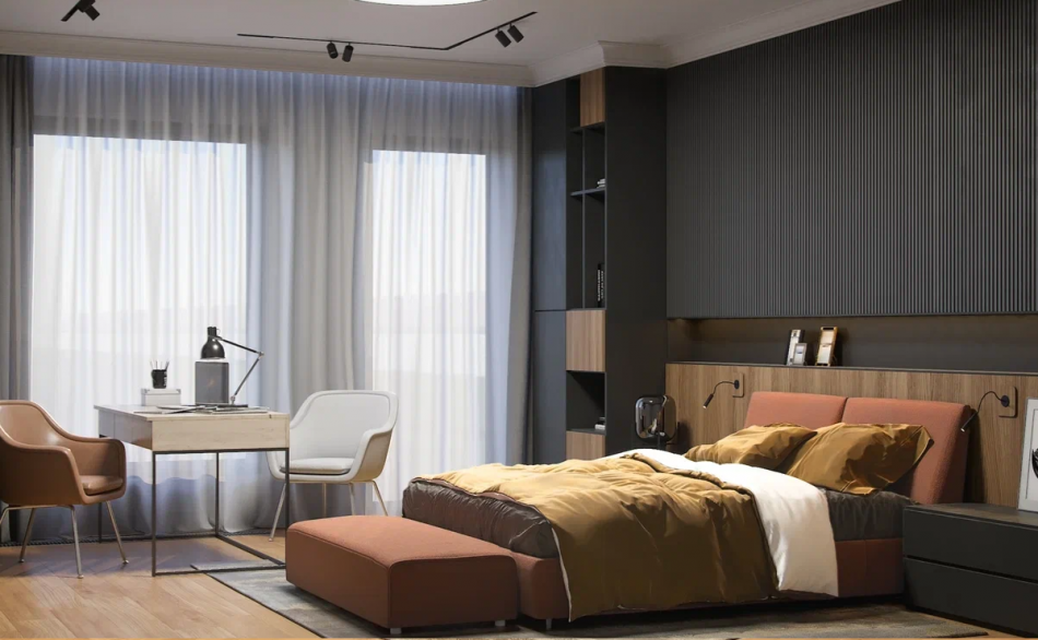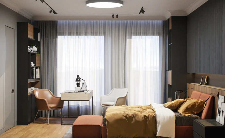 Поскольку глава семьи много работает по вечерам и не желает мешать домочадцам, была спроектирована и комната хозяина (кабинет + спальня). Это помещение также многофункционально, поскольку во время приезда гостей становится гостевой спальней. Комната оформлена в «брутальных» цветах: темно-серый, коричневый, бордо. Мужской характер помещения мы усилили за счет интересного приема в дизайне. У изголовья кровати разместили декоративные 3d-панели из МДФ, скрытые двери в санузел и гардеробную.