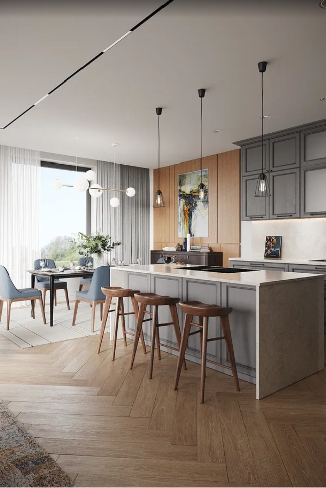 Одна из главных особенностей фешенебельной планировки – объединение 3 главных зон: кухни, столовой и гостиной. Данный дизайн-проект – не исключение. Мы стремились гармонично соединить все зоны воедино. Основными акцентными материалами были выбраны дерева, камень и металл, а цветами – белый, серебряный, серый и золотое дерево.