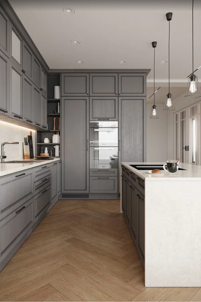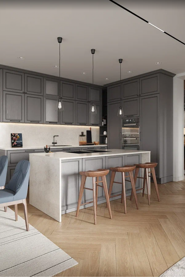 Дизайн-проект этого дома выделяется некоторыми редкими элементами. Например, в каждой спальне есть свой санузел и своя гардеробная комната, что очень удобно. Кухня-столовая – большая зона, где мы разместили не только кухонный гарнитур, но и сделали остров. Г-образная форма кухонного гарнитура позволяет на минимальной площади разместить максимум функционала. А на острове можно не только готовить, но и разместиться на комфортных барных стульях. Это очень удобно: во время готовки собеседник может присесть с бокалом вина и развлекать хозяйку разговорами. Удобство и комфорт – главная задача в создании интерьера.