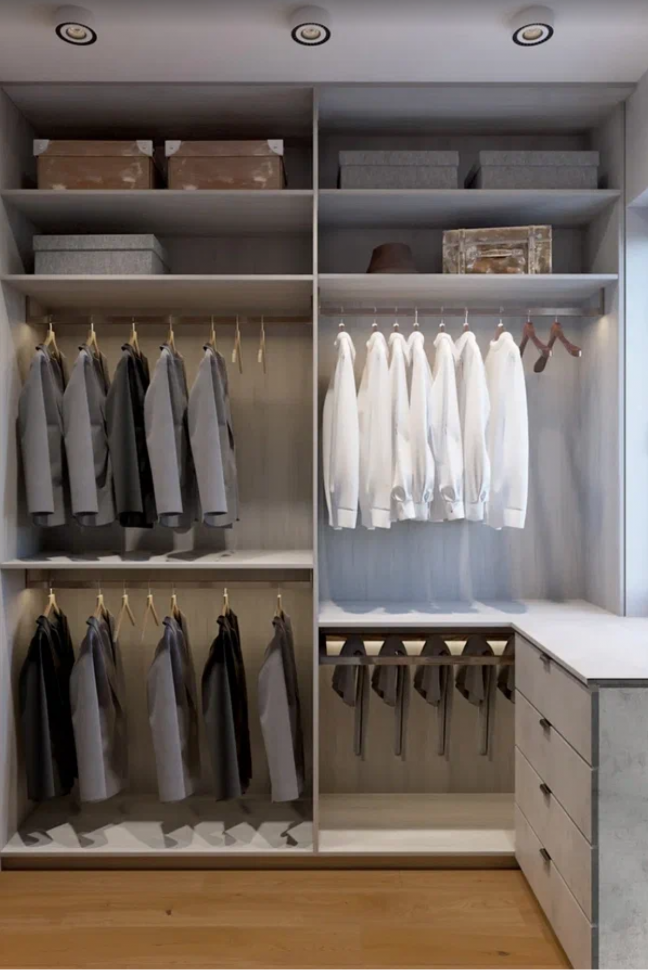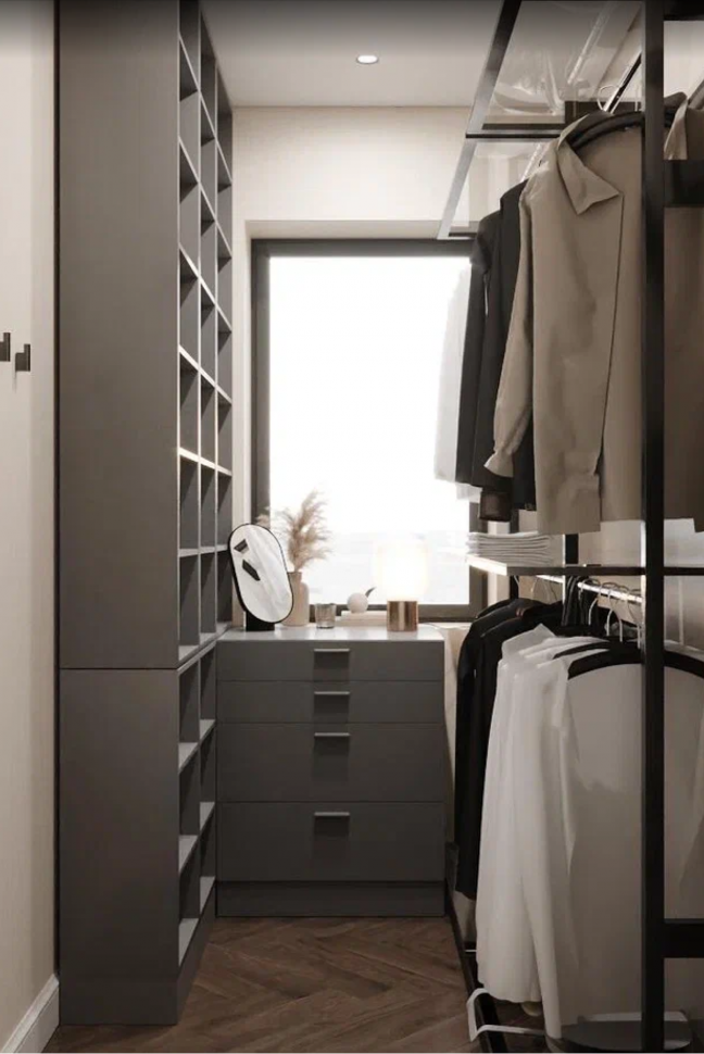 Хозяйственные помещения в дизайне интерьера уже не являются чем-то диковинным: топочная, постирочная, комната с душем-лапомойкой, гардеробная. Однако в этом проекте мы дополнили этот «хозяйственный минимум» второй гардеробной комнатой, в которой будут храниться сезонные вещи.