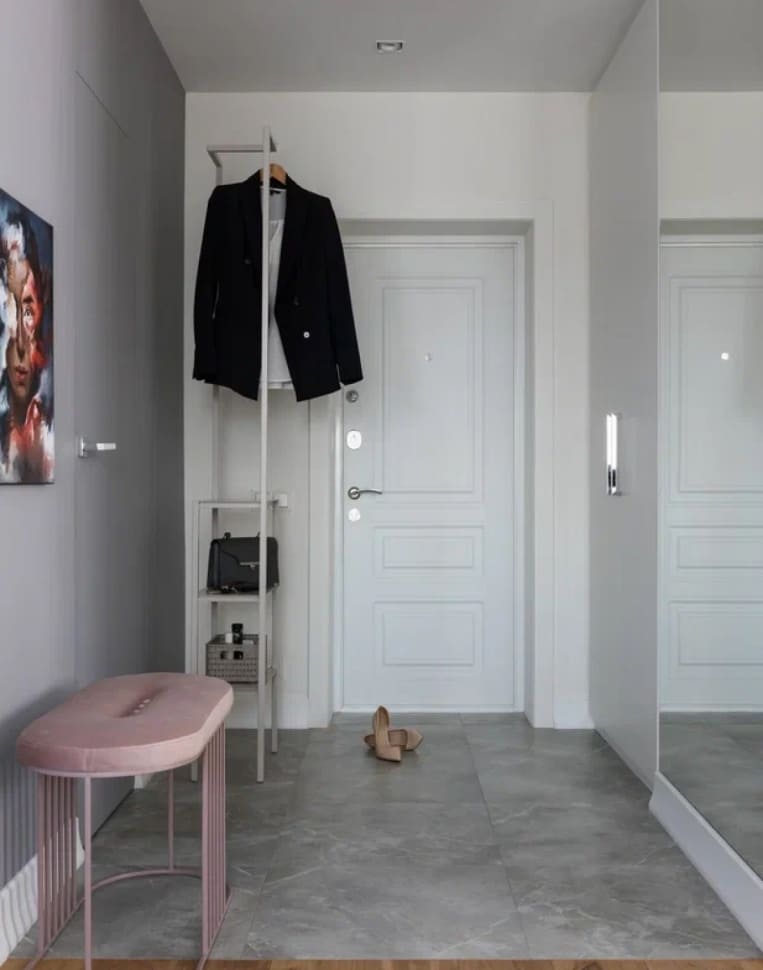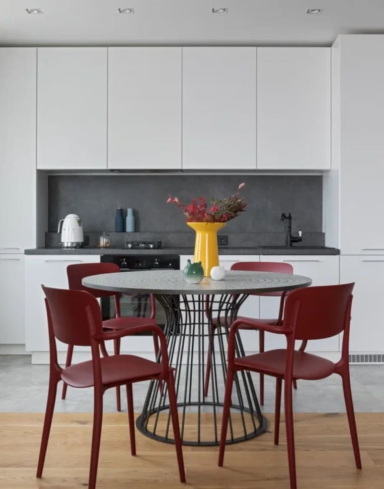 Белые и серые тона и максимально простая отделка в качестве основы позволили удачно расставить яркие акценты. Бордовые стулья, зеленое кресло, синий диван, розовая скамья, необычные картины – вся квартира наполнена цветом, но он не режет глаза.