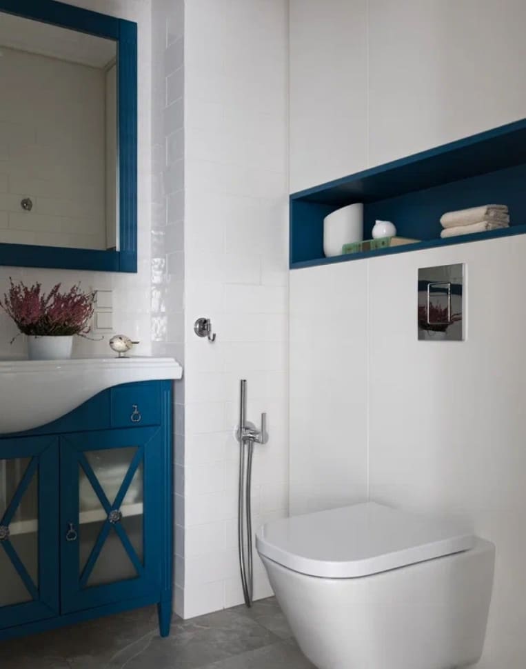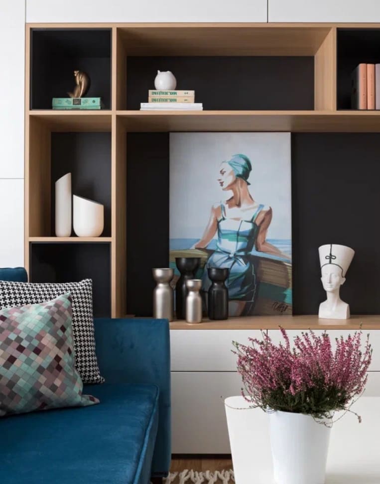Система хранения – минималистские встроенные шкафы – почти сливающиеся со стенами, изготовлена по эскизам Натальи Голубович. По эскизам дизайнера изготовлен на заказ и стильный синий диван в гостиной.