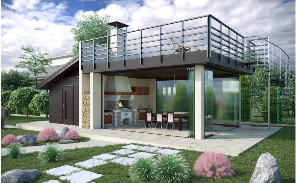 Изюминкой этого проекта стала стеклянная входная дверь, связывающая дизайн интерьера квартиры и природу. На террасе под навесом разместился милый столик и два кресла. Зона отдыха у дома специально сделана небольшой, поскольку на участке отдельно расположена зона барбекю. Уличная кухня мало чем отличается от «домашних». На ней, благодаря современной гриль-системе, можно готовить множество вкусных блюд, есть рабочая поверхность и мойка, большой стол.