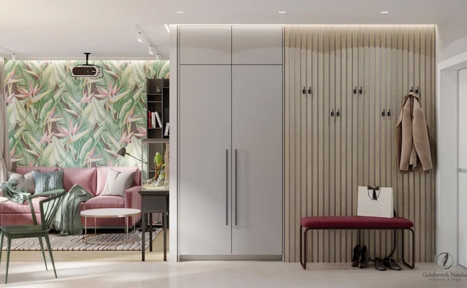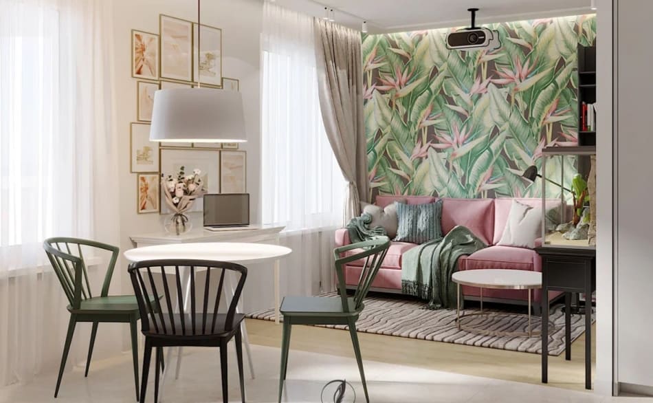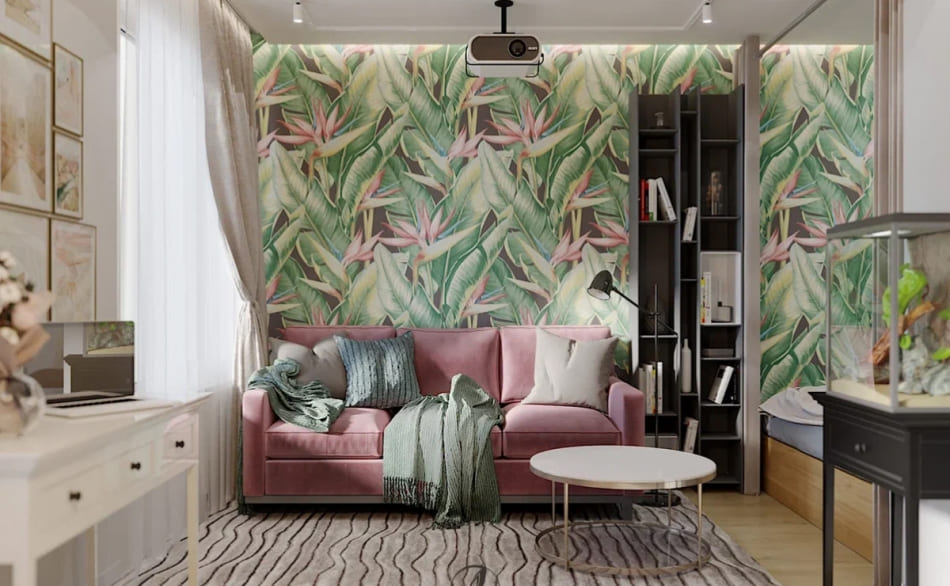 Заказчица хотела, чтобы в дизайне интерьера прослеживалась тема тропиков, поэтому с радостью приняла мою идею сделать одну акцентную стену. Используя холодный зеленый цвет, добились визуального эффекта удаления стены. Этот прием помог расширить пространство довольно небольшой однокомнатной квартиры.