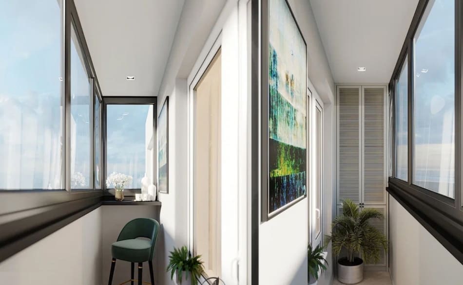 Небольшая ширина балкона (около 80 см) не позволила организовать там полноценную зону отдыха. Но незаметный шкаф и элегантный барный стул делают и это помещение полифункциональным.