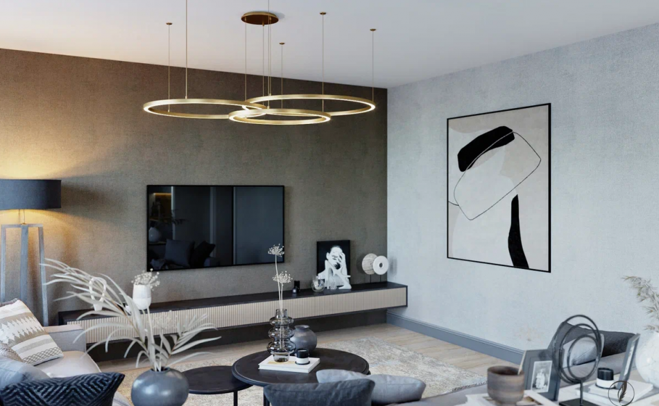 На первом этапе основным оттенком стен и потолков стал серый, на который хорошо ложится свет из окон. Чтобы еще лучше осветить пространство первого этажа, в проекте интерьера таунхауса активно используются возможности искусственного и естественного освещения.
