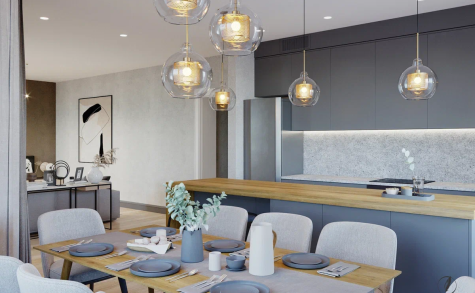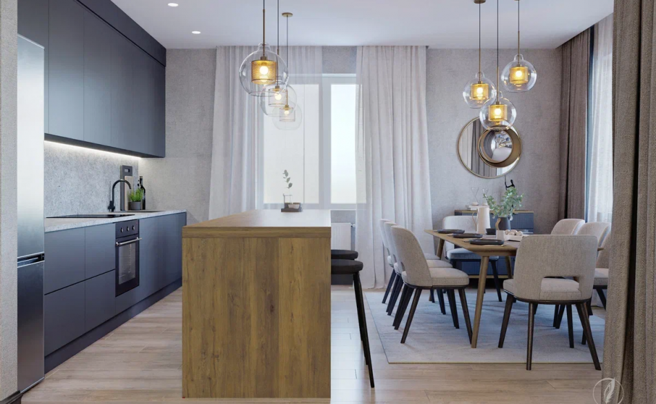 В центре большой функциональной кухни расположен остров с зоной для кофепауз или посиделок вдвоем, а также закрытые полки для хранения посуды и утвари. С одной стороны – большой обеденный стол, с другой – территория для приготовления пищи. Аккуратность и чистоту интерьера подчеркивают гладкие однотонные строгие линии. Сочетание дерева и серого и графичное цветовое решение с акцентной деревянной столешницей на насыщенно-сером фоне всегда смотрится беспроигрышно. Не обошлось и без эффектных контрастов: минималистские шкафы соседствуют с люстрами, напоминающими арт-объект из стекла и металла.