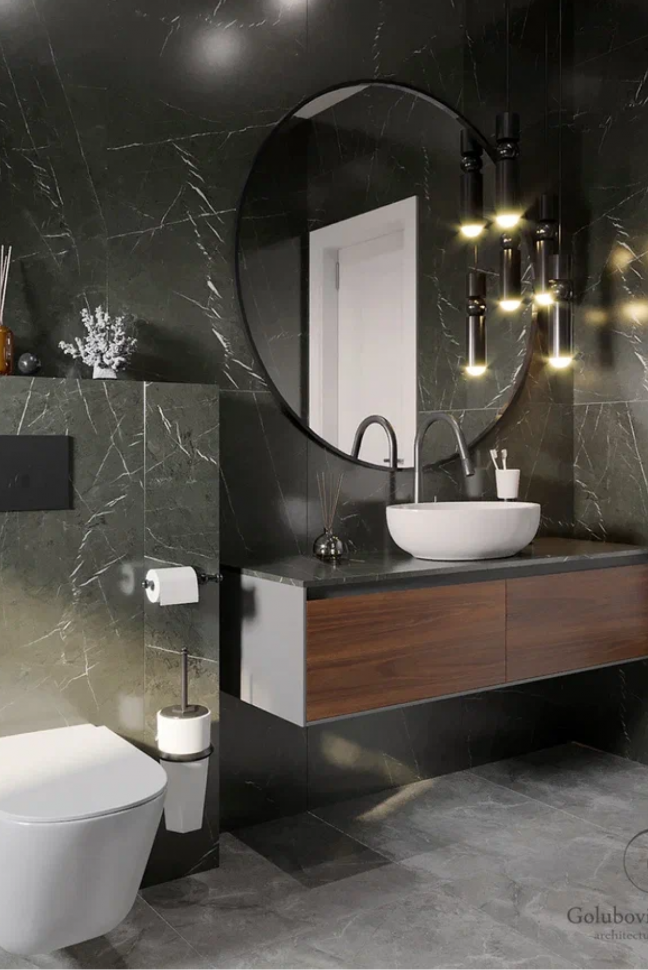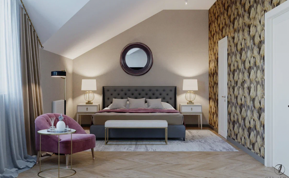 Подбор предметов в интерьере функционален и эстетичен – здесь массивное удобное кресло, стильный удобный пуф, элегантные круглые зеркала, футуристичные бра.