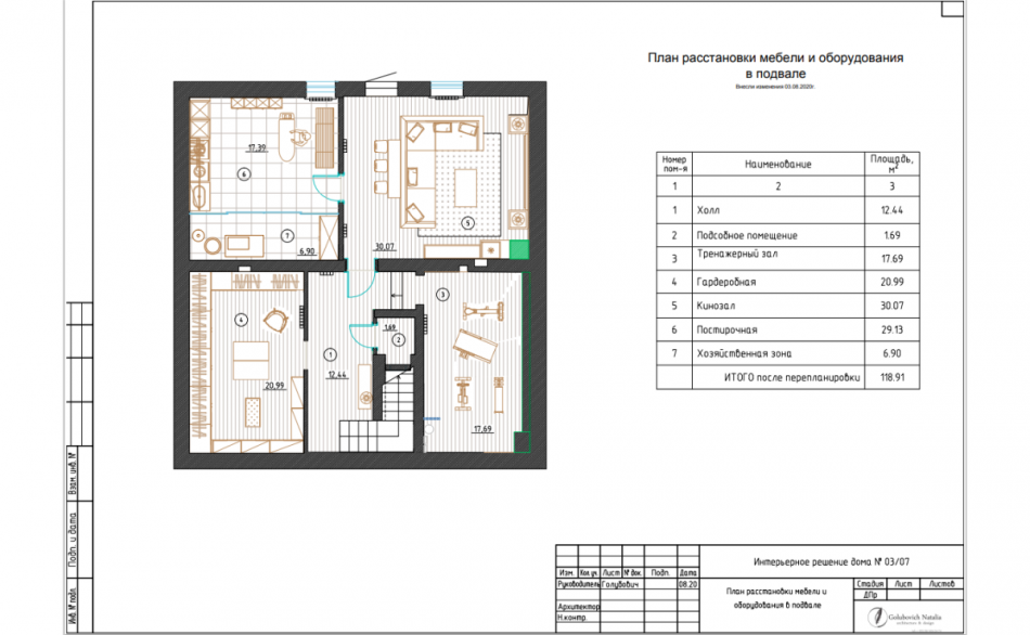 В подвале таунхауса разместили комнату отдыха-кинозал, небольшое помещение для занятия спортом, большую гардеробную, а также хозяйственное помещение.