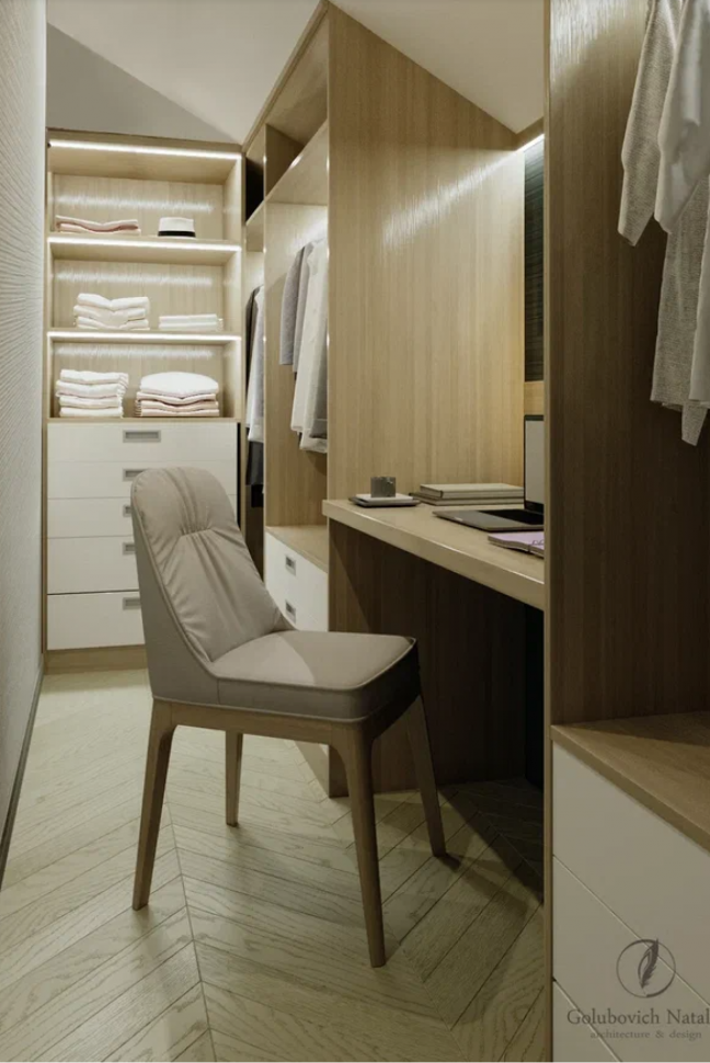 Среди светлых комнат оригинальным акцентом выделяется гардеробная с рабочей зоной. Нам удалось создать такую игру планировки, разместив между шкафами для одежды рабочий письменный стол. Неплохая идея – в такой обстановке от работы точно ничто не отвлекает.
