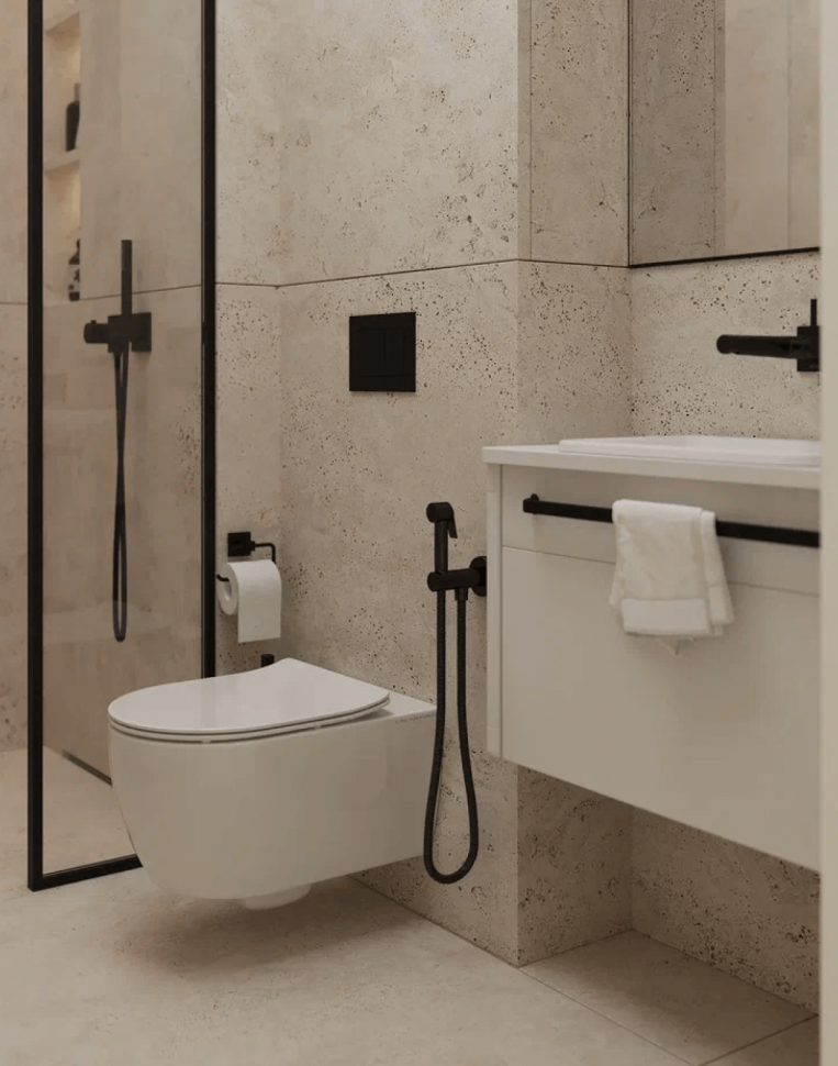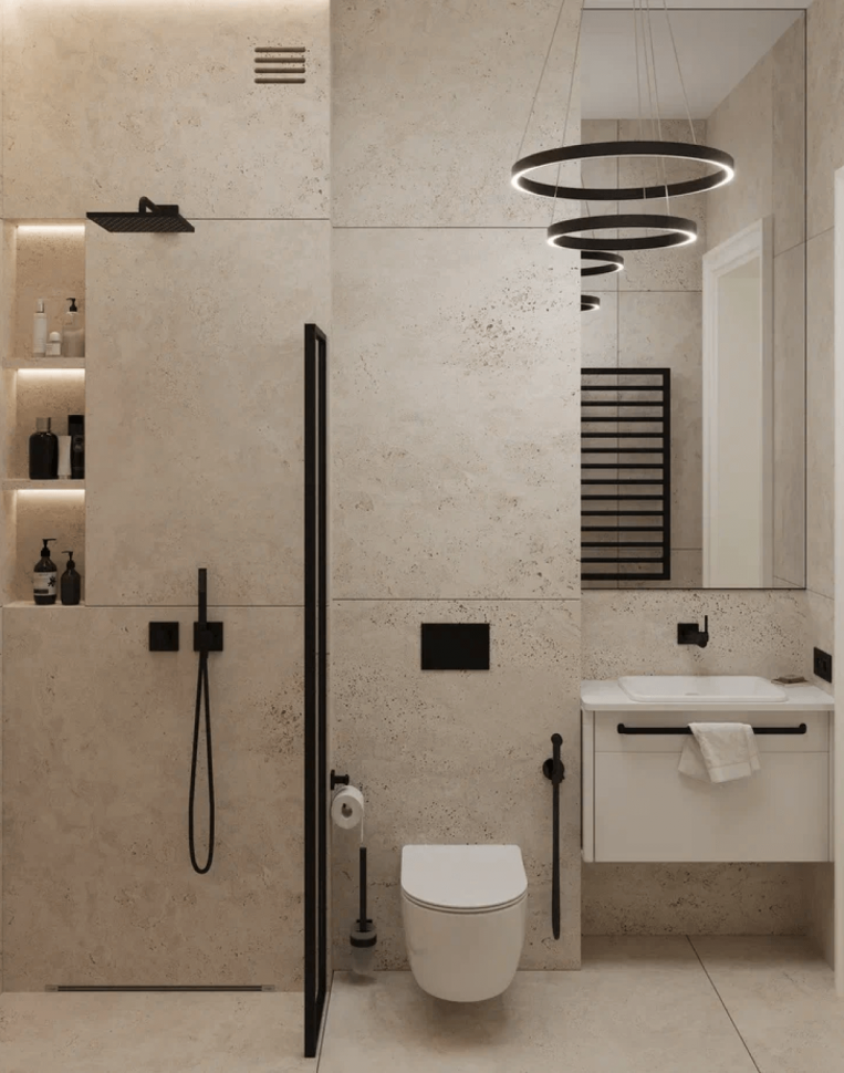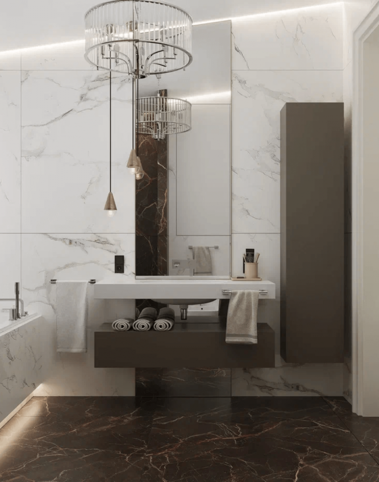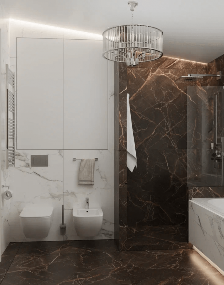 Интересным цветовым решением выделяются даже санузлы. Например, сочетание белого и молочного шоколада или песочного монохрома с насыщенно черным. Несмотря на то, что весь интерьер – светлый, он «разбавлен» яркими элементами. К примеру, такая деталь на люстре как малахитовые шары привносят изюминку в интерьер.