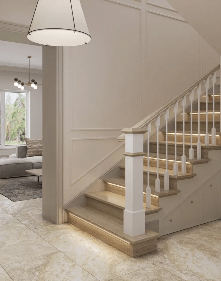 Заказчики просили разработать дизайн проект дома в современном стиле с элементами нео-классики. Была поставлена задача создать светлый и теплый интерьер. Подобного эффекта мы добились сочетанием текстуры натурального дерева с имитацией камня. На первом этаже уложили единое покрытие – керамогранит под камень. Сатиновая поверхность плитки эффектно преломляет свет из окон, словно немного играя.