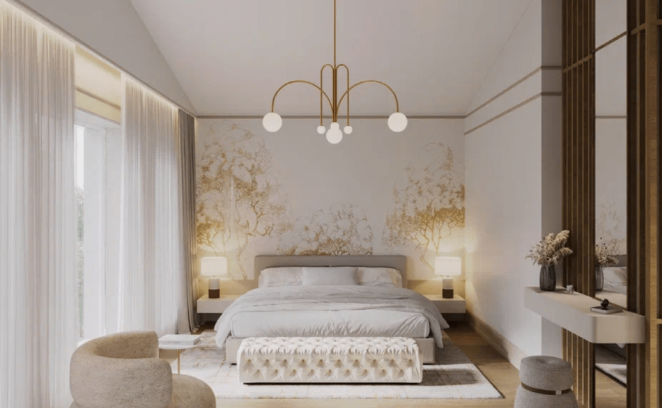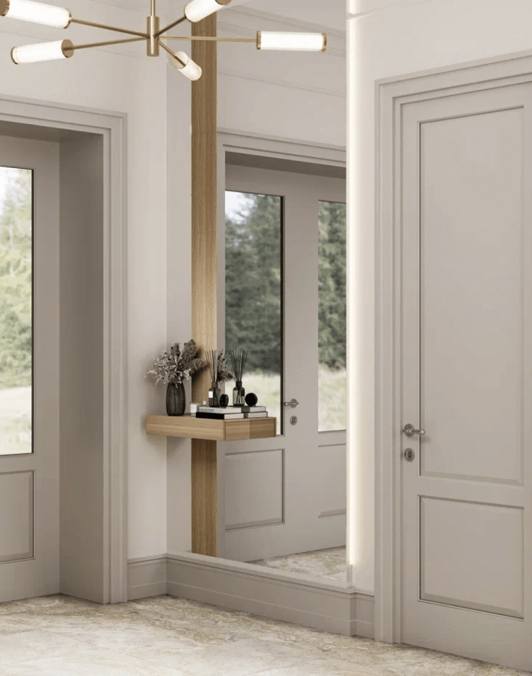 Стены практически везде предназначены под покраску, но встречается и комбинирование с деревянными и декоративными элементами. Так, лестничный холл решен в постельных тонах, а акцентом стала фреска с дополнительной проработкой и росписью на стенах. Тема природы также повторяется и в мастер-спальне у изголовья кровати. Изображение деревьев объединяет пространство дома с окружающим природным ландшафтом. Эту задачу решают и входные двери со стеклом, что делает изящный интерьер продолжением нежной природы.