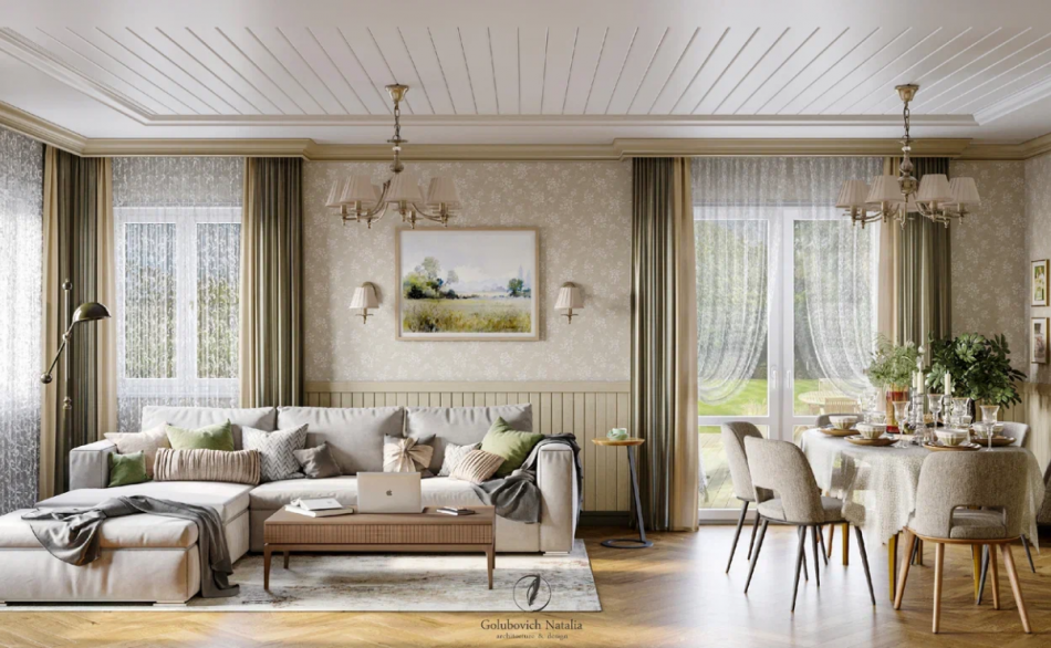 Приняв во внимание все пожелания заказчиков, для загородного дома выбрали теплые солнечные цвета, натуральные материалы и природные оттенки, поэтому даже стены пропитаны атмосферой спокойствия. В интерьере преобладают пастельные, спокойные цвета: охра, бежевый, травяной. Подобное цветовое решение позволяет ощутить себя в деревенском доме из детства, в котором когда-то гостил у бабушки. Поэтому закономерно, что в проекте преобладают природные мотивы.