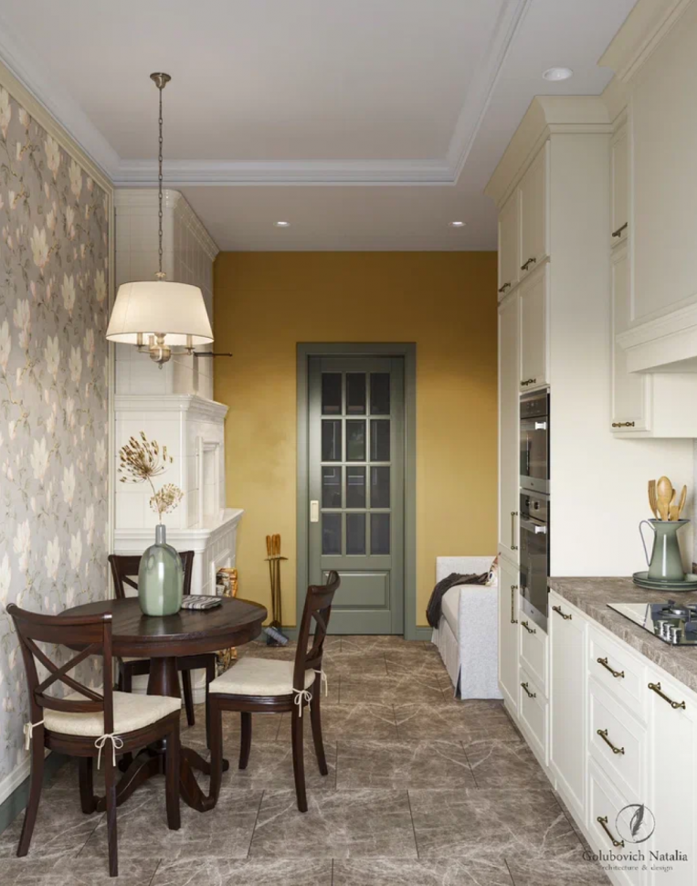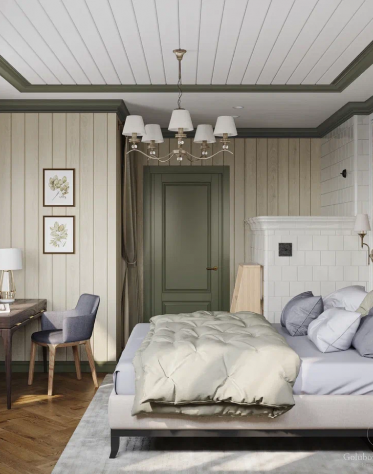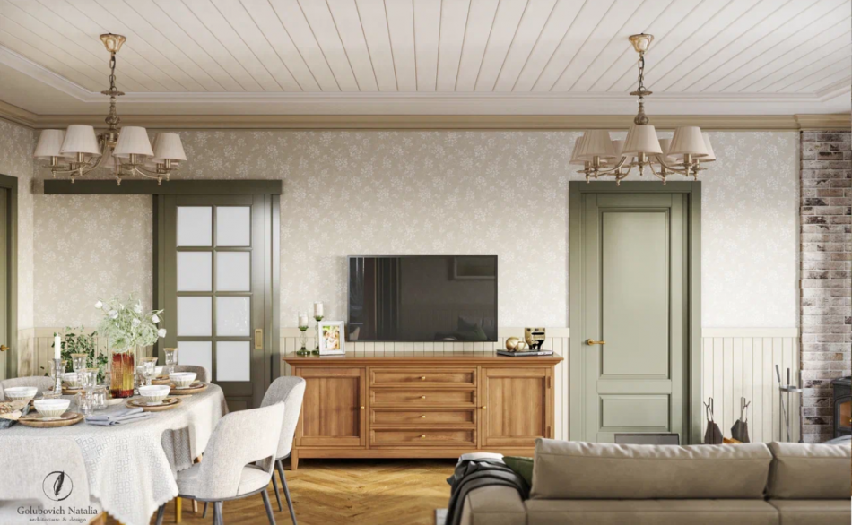 На потолке также комбинация гипсокартона и вагонки. Стены оклеены обоями с мелким принтом. Подобный рисунок также придает интерьеру теплую атмосферу деревенского жилища.