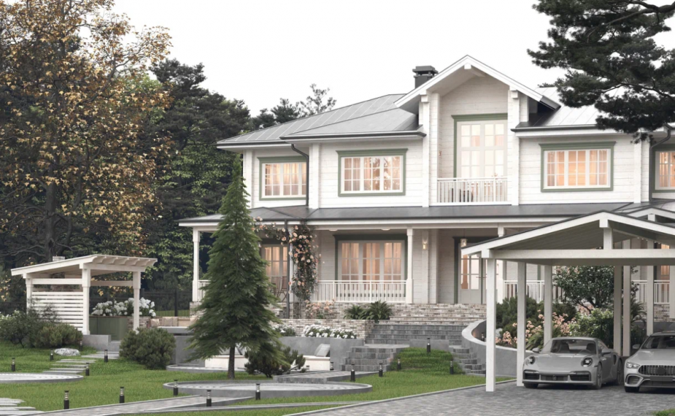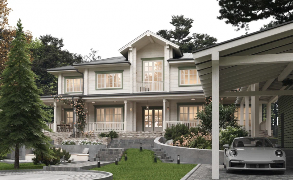 Дом в американском стиле идеально подходит для семей, ведущих активный образ жизни, особенно для семейных пар с детьми. В итоге на чертежах был «построен» просторный двухэтажный коттедж, с крышей сложной формы и большим количеством окон.