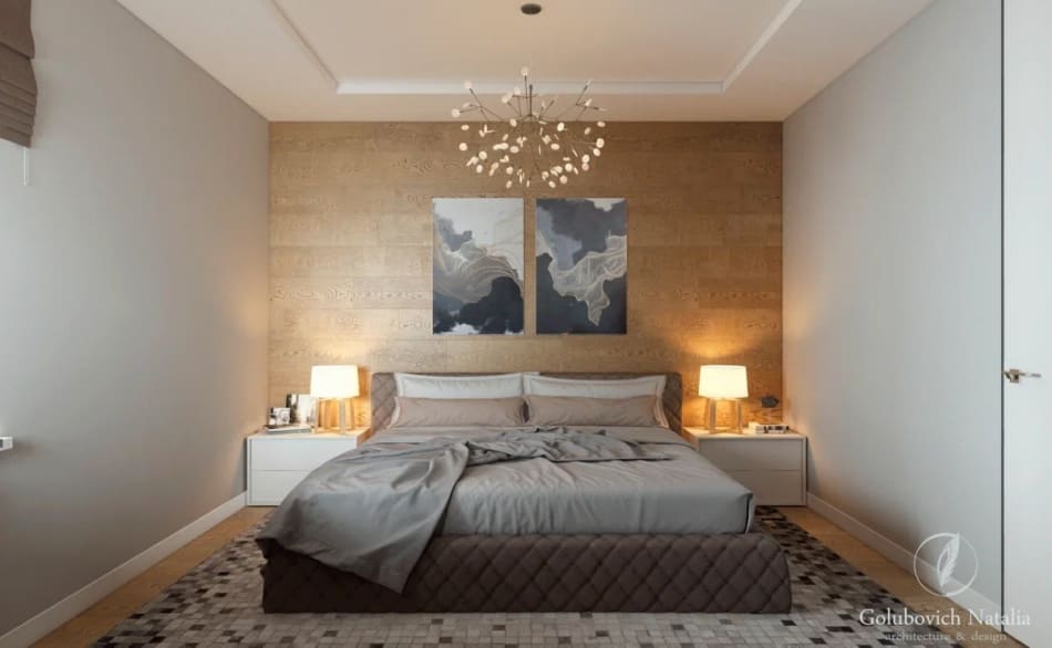 В отделке спальни нет ничего лишнего, в оформлении преобладает оттенок серого, но она не кажется скучной и безликой. Облицовка одной из стен в спальне выполнена деревянными панелями с чёткими горизонтальными линиями. В ванной комнате присутствует та же «прямолинейность» – вся сантехника имеет правильные геометрические формы.