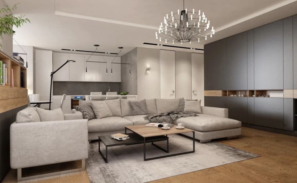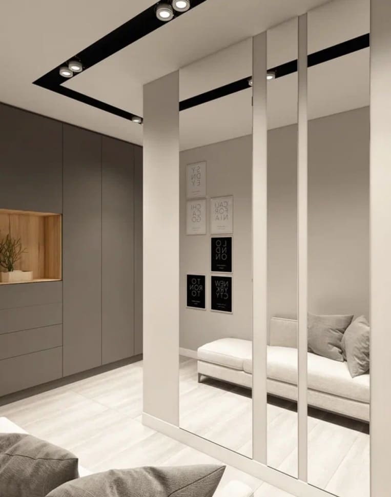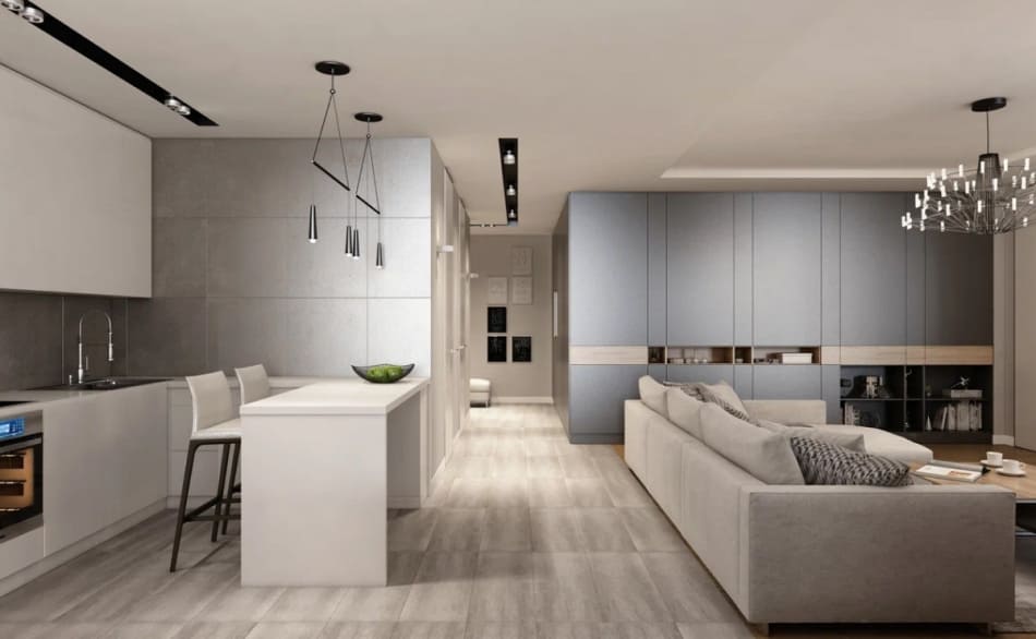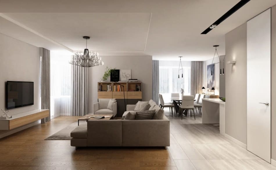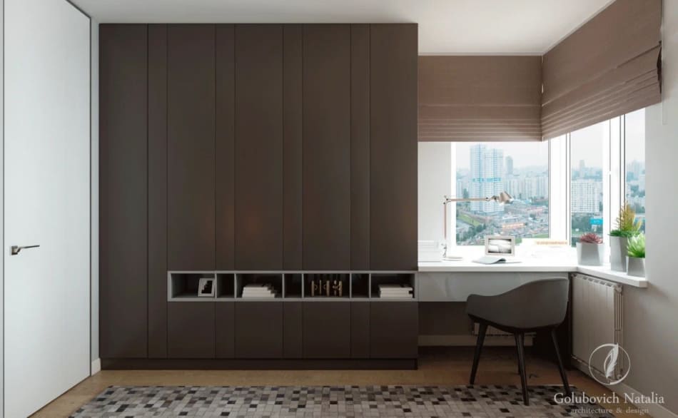 Дизайнер стремился уйти от деталей, чтобы пространство было единым. Также были заменены обычные двери на двери-невидимки. В случаях, когда полотно и отделка стены в одном тоне, как в нашем дизайн проекте, можно использовать алюминиевый профиль на торец полотна и полотно на тон светлее стены, нежели основная стена.