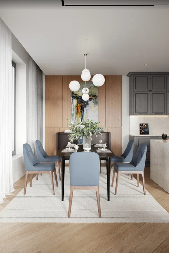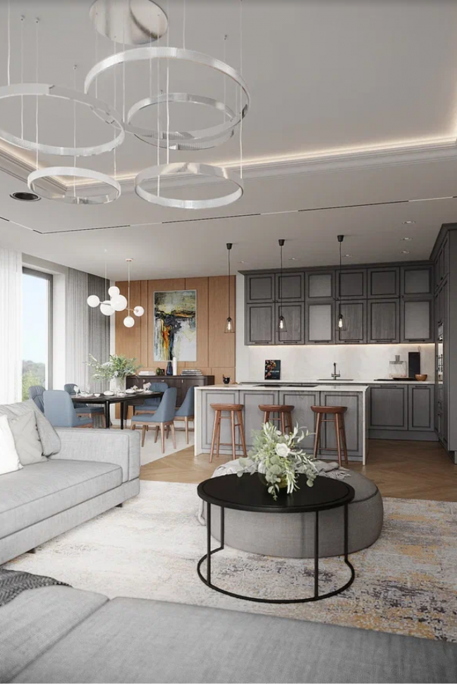 Одна из главных особенностей фешенебельной планировки – объединение 3 главных зон: кухни, столовой и гостиной. Данный дизайн-проект – не исключение. Мы стремились гармонично соединить все зоны воедино. Основными акцентными материалами были выбраны дерева, камень и металл, а цветами – белый, серебряный, серый и золотое дерево.