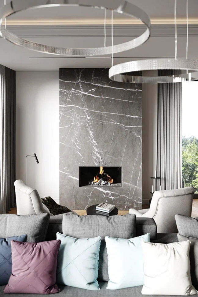 К отдыху располагает и планировка гостиной: окна в пол, большой ТВ-экран, современная стереосистема, комфортные диваны, приятные глазу оттенки в отделке стен и пола. Изюминкой этого помещения стал объёмный круглый пуф-столик и камин позади дивана, облицованный камнем.
