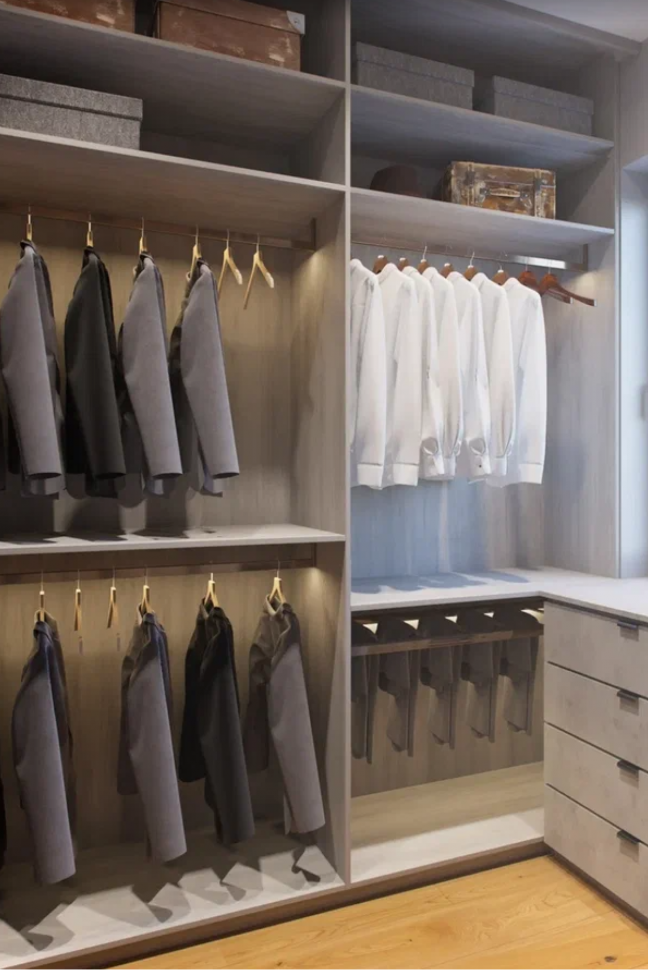 Хозяйственные помещения в дизайне интерьера уже не являются чем-то диковинным: топочная, постирочная, комната с душем-лапомойкой, гардеробная. Однако в этом проекте мы дополнили этот «хозяйственный минимум» второй гардеробной комнатой, в которой будут храниться сезонные вещи.