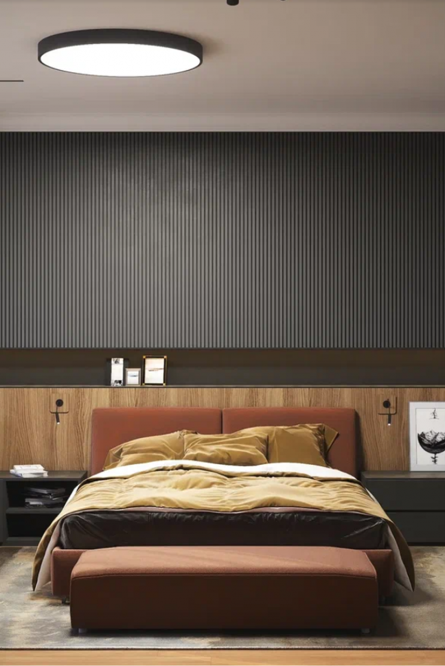 Поскольку глава семьи много работает по вечерам и не желает мешать домочадцам, была спроектирована и комната хозяина (кабинет + спальня). Это помещение также многофункционально, поскольку во время приезда гостей становится гостевой спальней. Комната оформлена в «брутальных» цветах: темно-серый, коричневый, бордо. Мужской характер помещения мы усилили за счет интересного приема в дизайне. У изголовья кровати разместили декоративные 3d-панели из МДФ, скрытые двери в санузел и гардеробную.