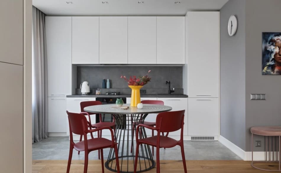Белые и серые тона и максимально простая отделка в качестве основы позволили удачно расставить яркие акценты. Бордовые стулья, зеленое кресло, синий диван, розовая скамья, необычные картины – вся квартира наполнена цветом, но он не режет глаза.