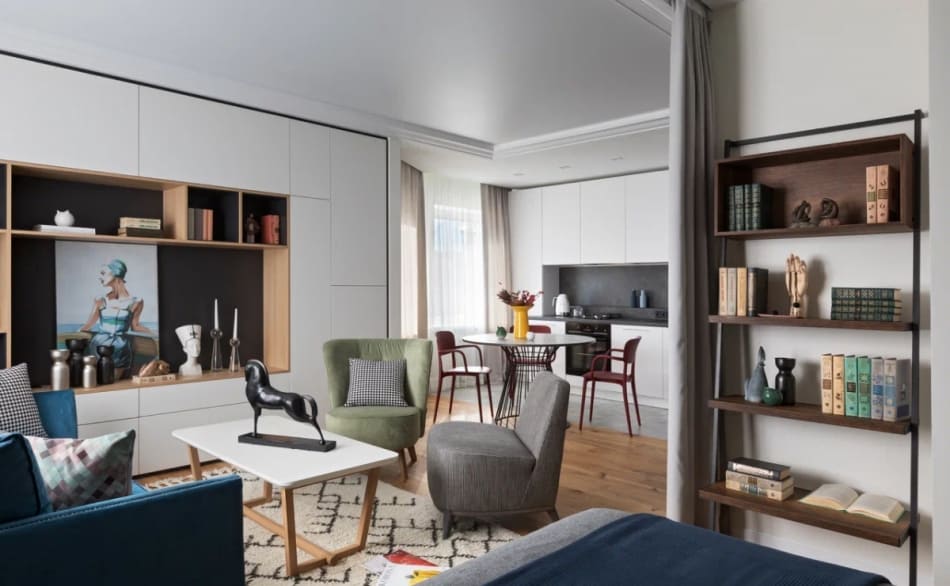Желанием клиентки была функциональная и уютная квартира. Мы сумели превратить небольшую студию в комфортное пространство в современном стиле. Архитектура и дизайн интерьера выполнены в стильной цветовой гамме: белые и серые тона с яркими акцентами.