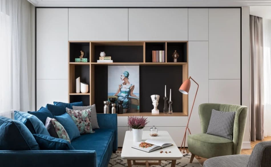 Система хранения – минималистские встроенные шкафы – почти сливающиеся со стенами, изготовлена по эскизам Натальи Голубович. По эскизам дизайнера изготовлен на заказ и стильный синий диван в гостиной.