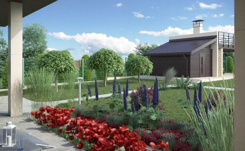 Не последнюю роль в оформлении участка играет освещение: хорошо продуманные световые акценты не только освещают территорию, но и выполняют декоративную функцию. В данном проекте светильники установлены так, чтобы подчеркнуть наиболее удачные виды из окон и выделить приватные и публичные зоны.