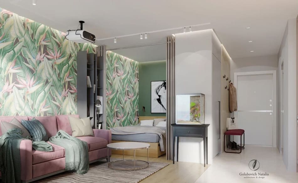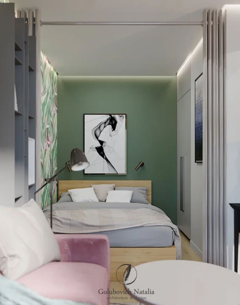 Заказчица хотела, чтобы в дизайне интерьера прослеживалась тема тропиков, поэтому с радостью приняла мою идею сделать одну акцентную стену. Используя холодный зеленый цвет, добились визуального эффекта удаления стены. Этот прием помог расширить пространство довольно небольшой однокомнатной квартиры.