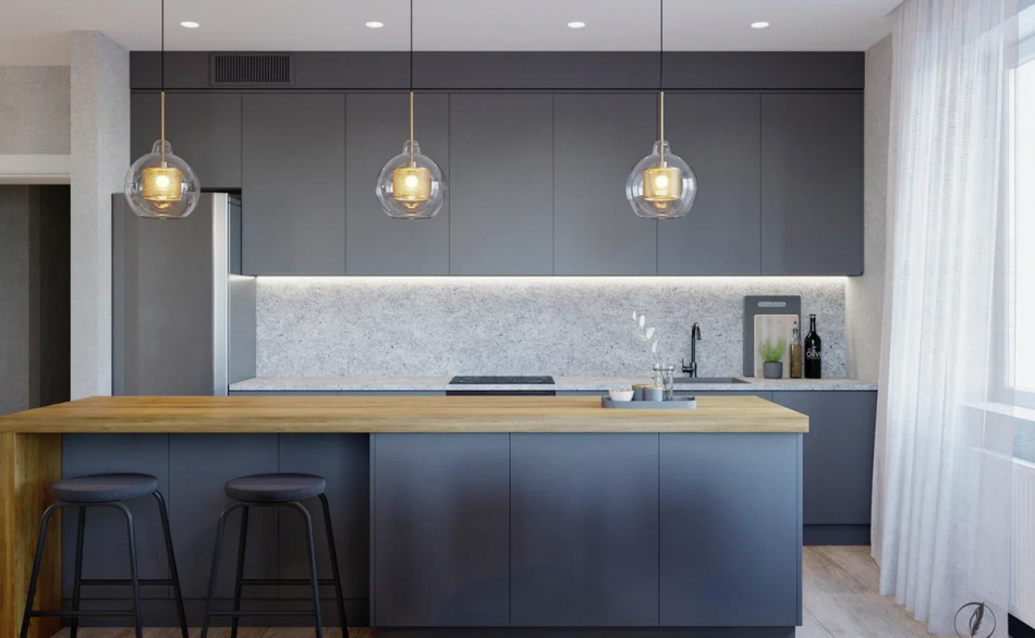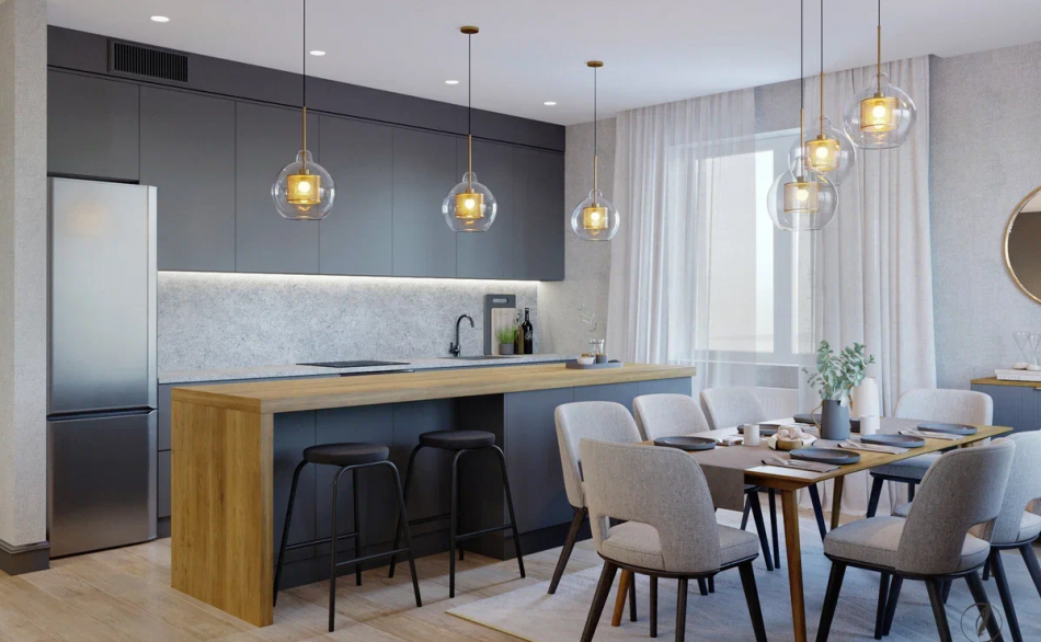 В центре большой функциональной кухни расположен остров с зоной для кофепауз или посиделок вдвоем, а также закрытые полки для хранения посуды и утвари. С одной стороны – большой обеденный стол, с другой – территория для приготовления пищи. Аккуратность и чистоту интерьера подчеркивают гладкие однотонные строгие линии. Сочетание дерева и серого и графичное цветовое решение с акцентной деревянной столешницей на насыщенно-сером фоне всегда смотрится беспроигрышно. Не обошлось и без эффектных контрастов: минималистские шкафы соседствуют с люстрами, напоминающими арт-объект из стекла и металла.