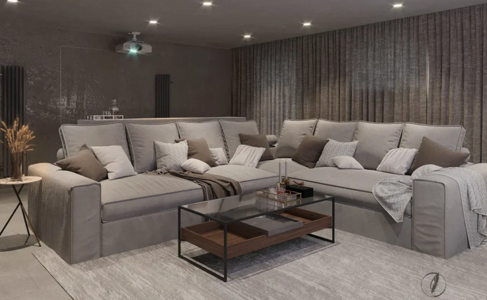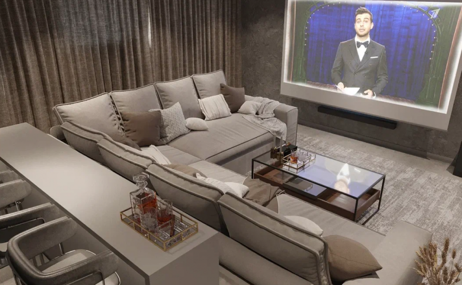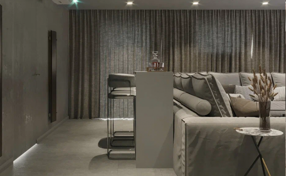В кинозале за диваном разместили барную стойку и стулья для тех, кто пожелает сменить ощущение семейных посиделок на веселье с друзьями.
