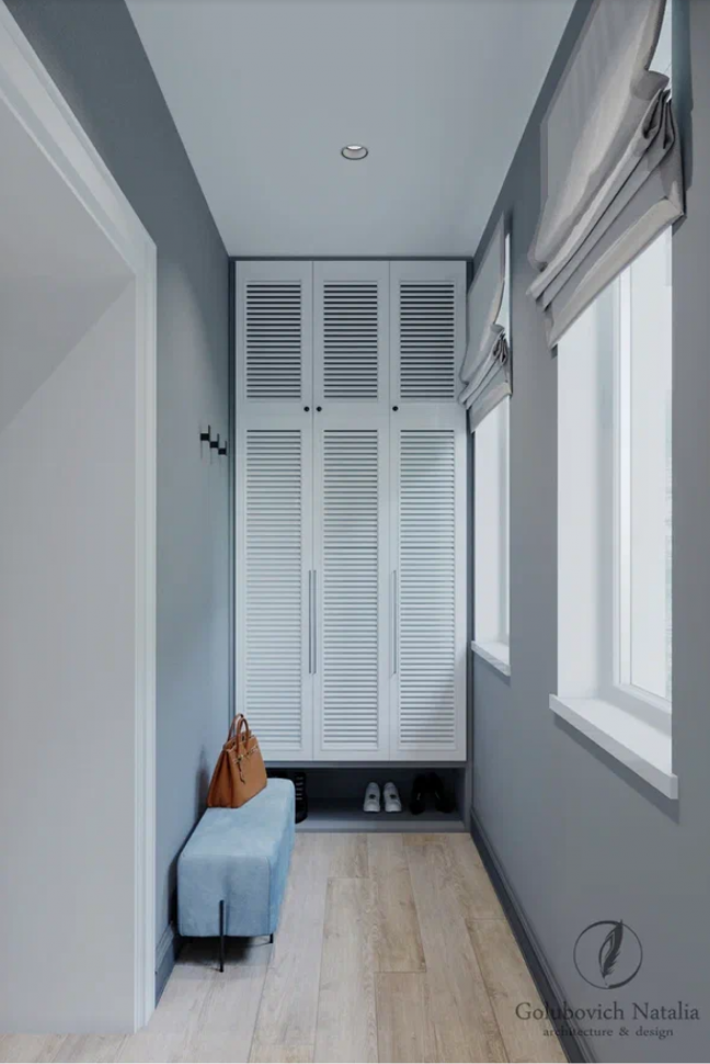 Среди светлых комнат оригинальным акцентом выделяется гардеробная с рабочей зоной. Нам удалось создать такую игру планировки, разместив между шкафами для одежды рабочий письменный стол. Неплохая идея – в такой обстановке от работы точно ничто не отвлекает.