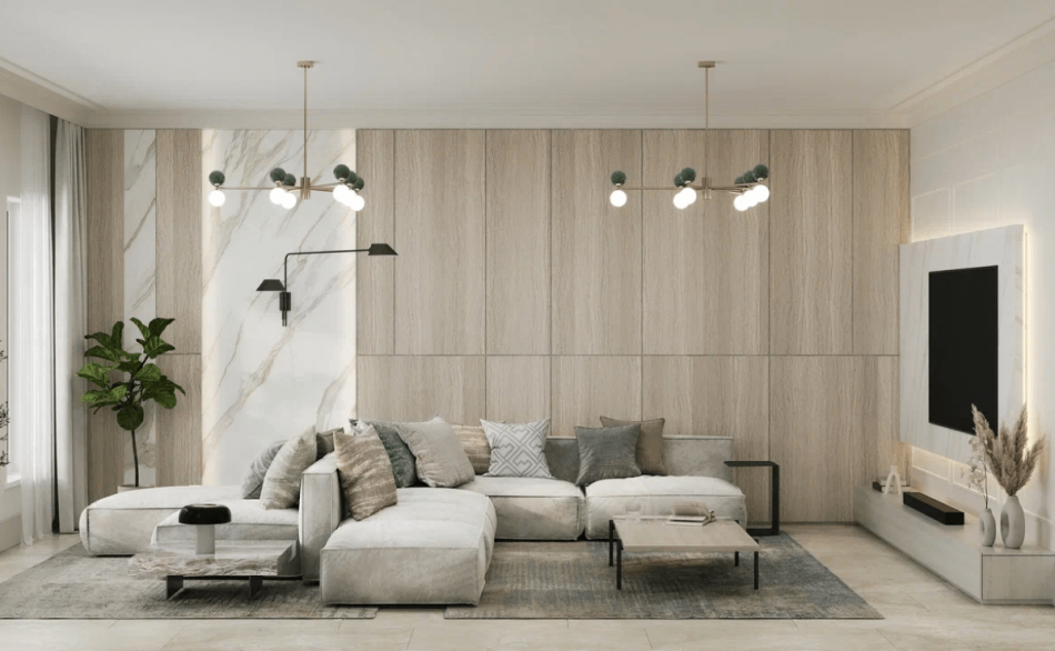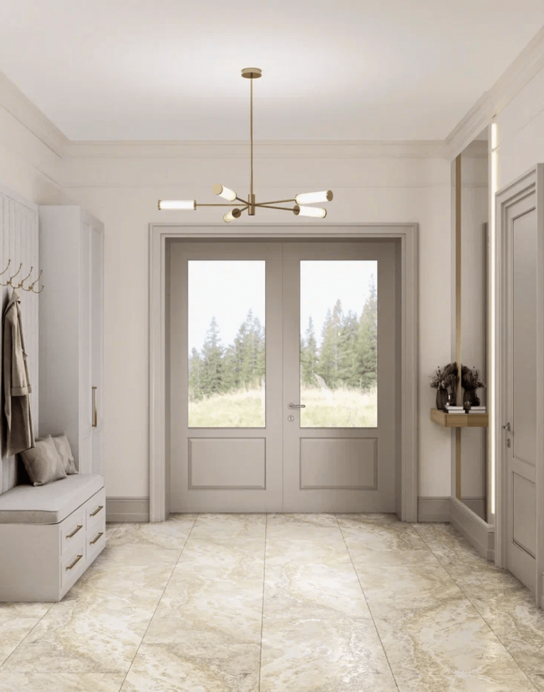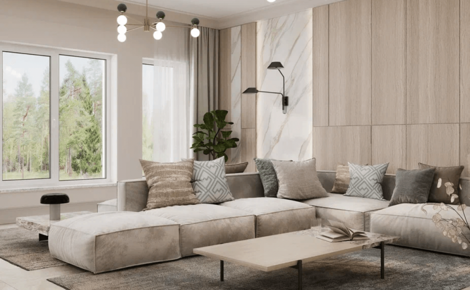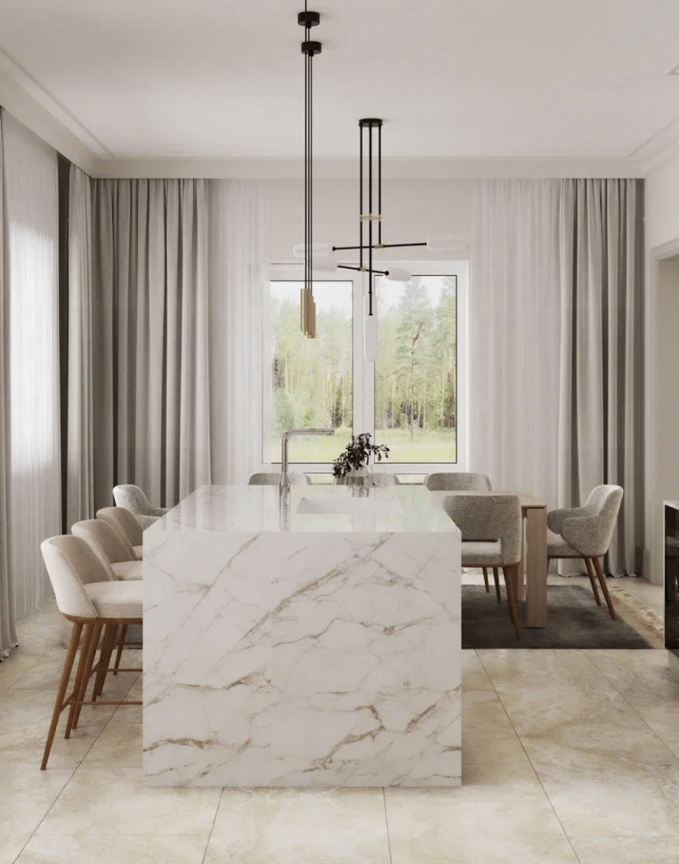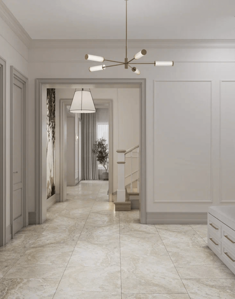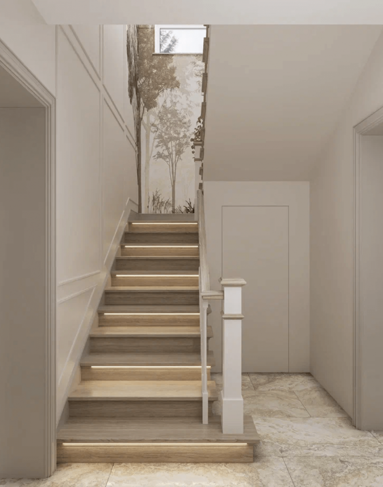 Заказчики просили разработать дизайн проект дома в современном стиле с элементами нео-классики. Была поставлена задача создать светлый и теплый интерьер. Подобного эффекта мы добились сочетанием текстуры натурального дерева с имитацией камня. На первом этаже уложили единое покрытие – керамогранит под камень. Сатиновая поверхность плитки эффектно преломляет свет из окон, словно немного играя.