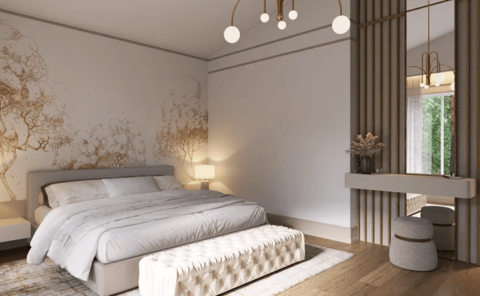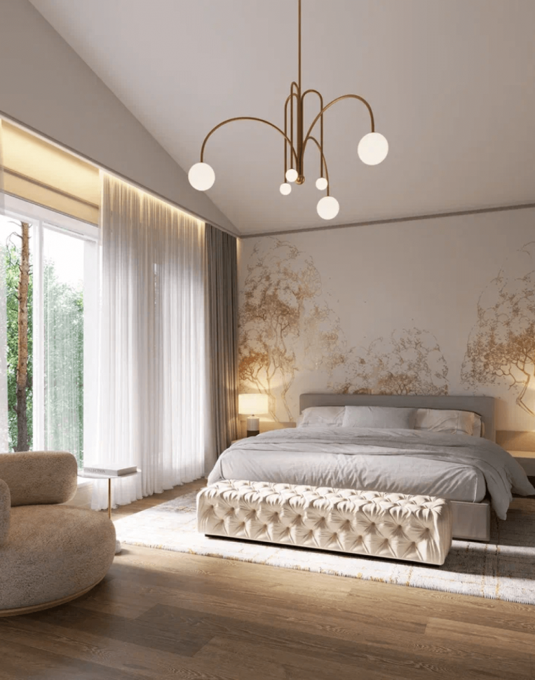 Стены практически везде предназначены под покраску, но встречается и комбинирование с деревянными и декоративными элементами. Так, лестничный холл решен в постельных тонах, а акцентом стала фреска с дополнительной проработкой и росписью на стенах. Тема природы также повторяется и в мастер-спальне у изголовья кровати. Изображение деревьев объединяет пространство дома с окружающим природным ландшафтом. Эту задачу решают и входные двери со стеклом, что делает изящный интерьер продолжением нежной природы.