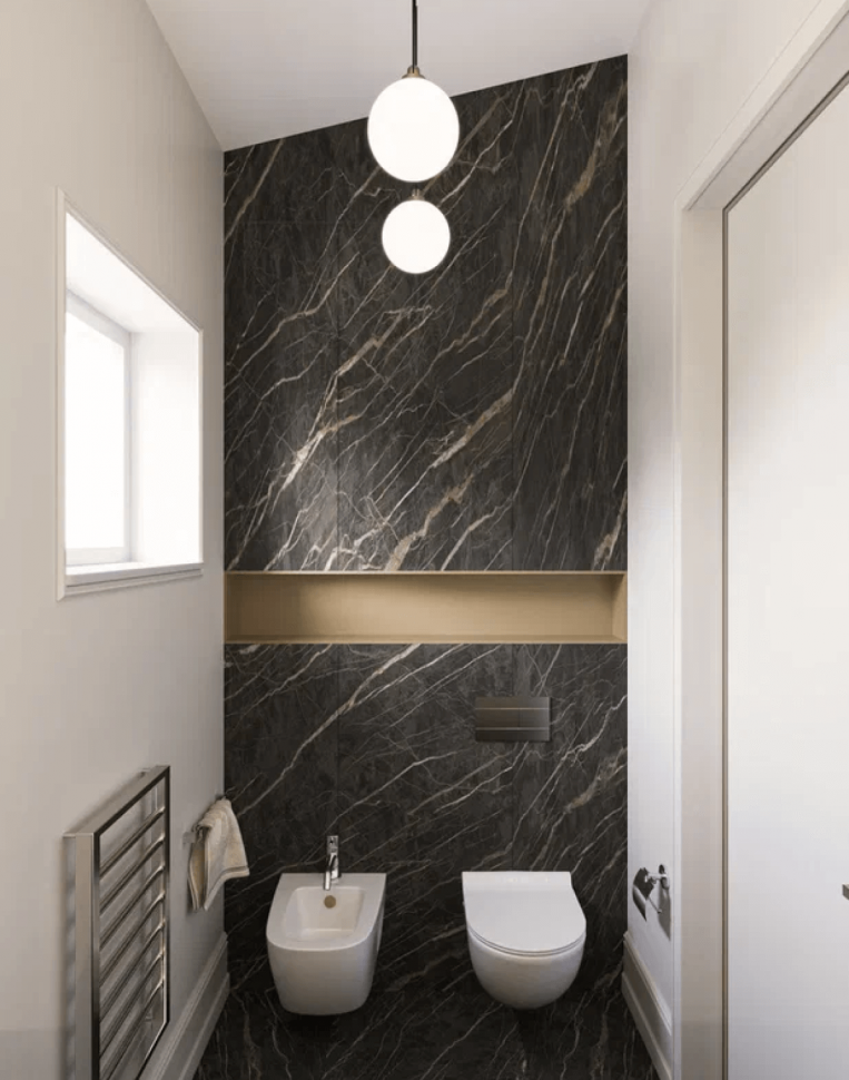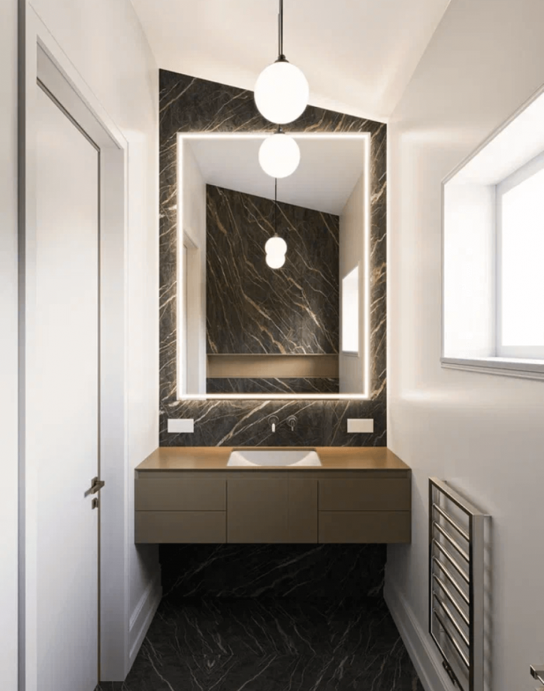 Интересным цветовым решением выделяются даже санузлы. Например, сочетание белого и молочного шоколада или песочного монохрома с насыщенно черным. Несмотря на то, что весь интерьер – светлый, он «разбавлен» яркими элементами. К примеру, такая деталь на люстре как малахитовые шары привносят изюминку в интерьер.