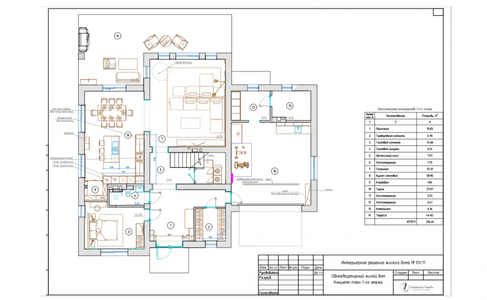 Дом, хоть и находится за городом, но предназначен для постоянного проживания. Поэтому мы стремились в расположении комнат учесть все пожелания заказчиков. Планировка первого этажа включает прихожую, гостиную, кухню-столовую, гостевую комнату и санузел, гардеробную, а также котельную и хозяйственные помещения. План первого этажа также предполагает гараж со спортивным снаряжением и террасу для релакса.