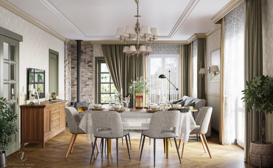 Приняв во внимание все пожелания заказчиков, для загородного дома выбрали теплые солнечные цвета, натуральные материалы и природные оттенки, поэтому даже стены пропитаны атмосферой спокойствия. В интерьере преобладают пастельные, спокойные цвета: охра, бежевый, травяной. Подобное цветовое решение позволяет ощутить себя в деревенском доме из детства, в котором когда-то гостил у бабушки. Поэтому закономерно, что в проекте преобладают природные мотивы.