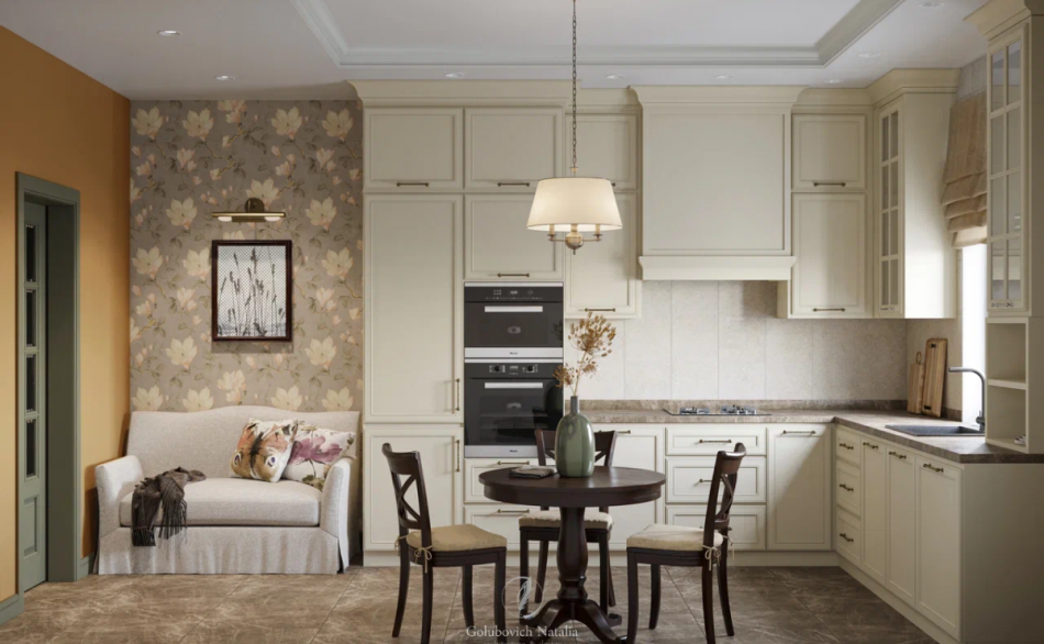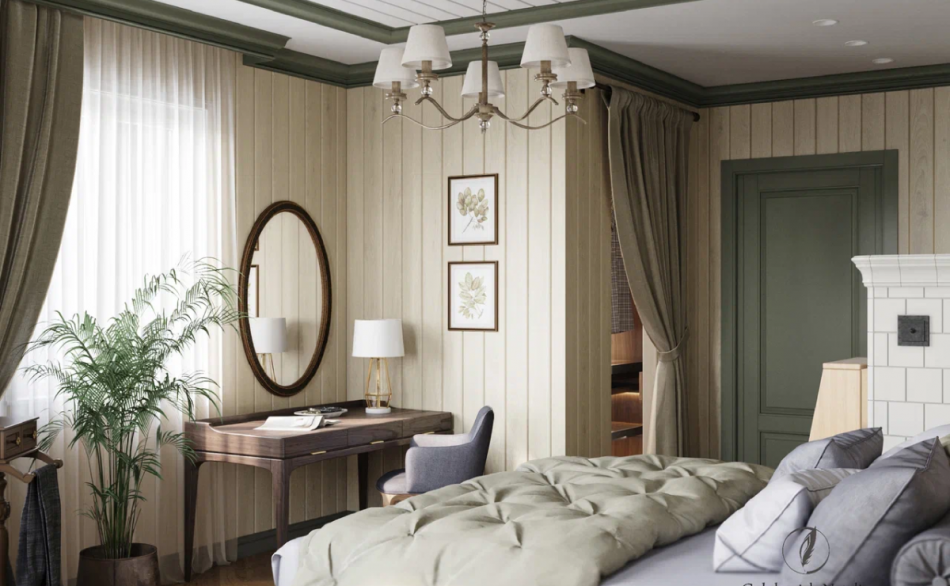 На потолке также комбинация гипсокартона и вагонки. Стены оклеены обоями с мелким принтом. Подобный рисунок также придает интерьеру теплую атмосферу деревенского жилища.