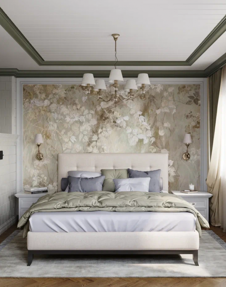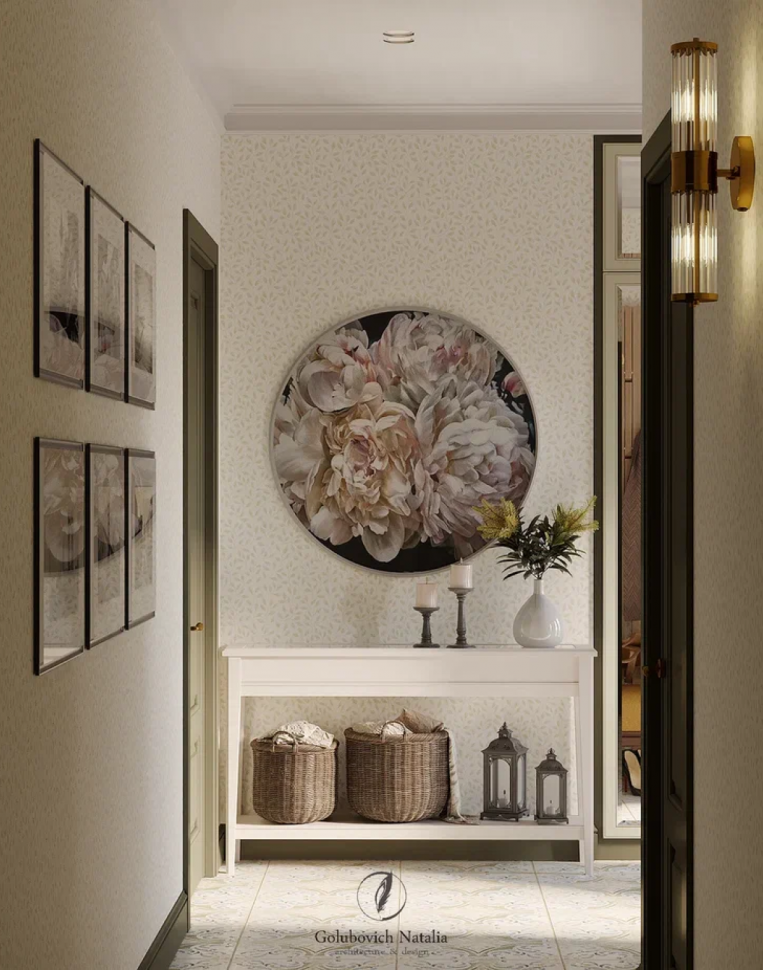 Интересная деталь в этом дизайн-проекте – фреска с природной тематикой в изголовье кровати в спальне. Светло-зеленый, золотой, нежно-желтый… Цветочные мотивы фрески созвучны круглой оригинальной картине в прихожей, оттенку кухонного гарнитура, плитке на полу в кухне, паркету в кабинете. Все детали интерьера объединяют каждое помещение в единую концепцию.
